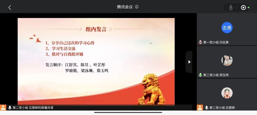 艺创系学生第一、第二党小组于9月29日在腾讯会议顺利开展党小组会议。本次会议内容旨在学习《更好发挥广东先行示范作用四论认真学习贯彻省委十三届五次全会精神》主持会议的是第二党小组组长吕慧婷同志。