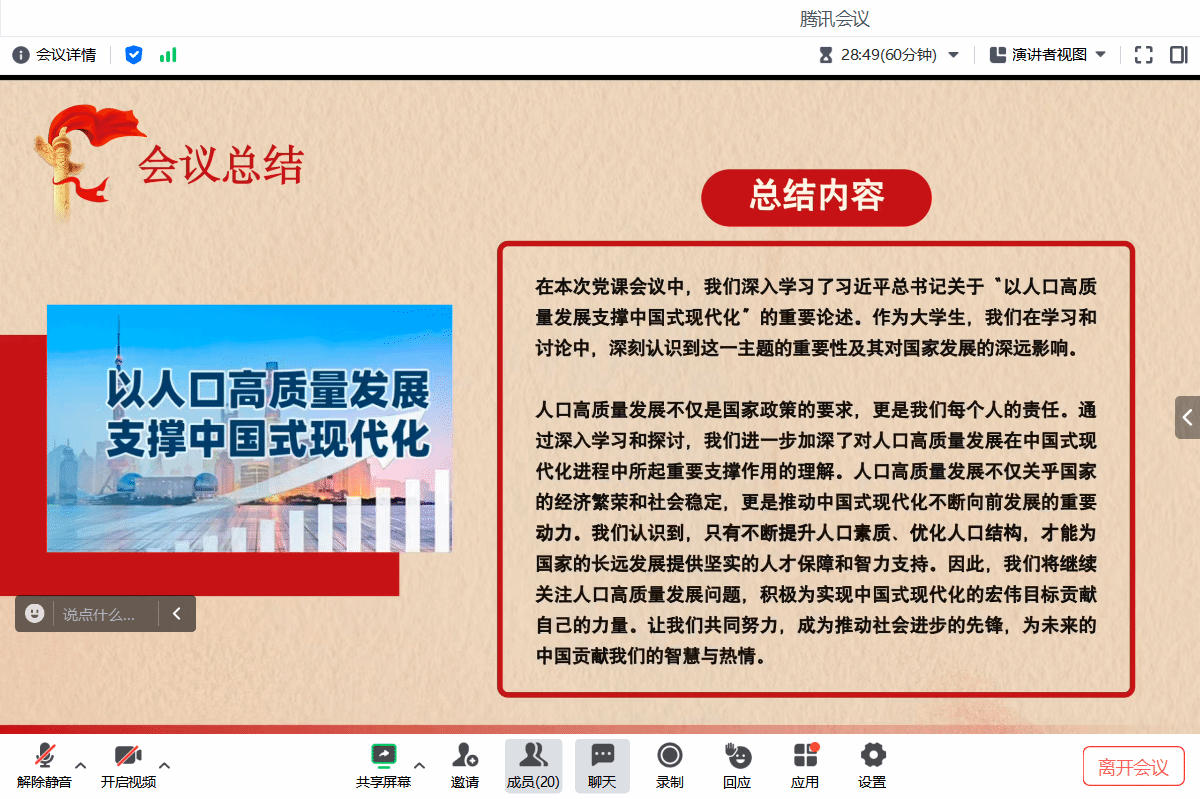 通过本次党小组会议,艺术太阳成集团tyc33455学生党支部第一党小组的同志们深刻认识到,人口的高质量发展不仅是国家战略的核心内容也是我们作为青年大学生的责任所在。希望第一党小组的同志们时刻保持学习的热情和实践的积极性,努力提升个人素养,积极在新时代的征程中展现出大学生党员的风采。
