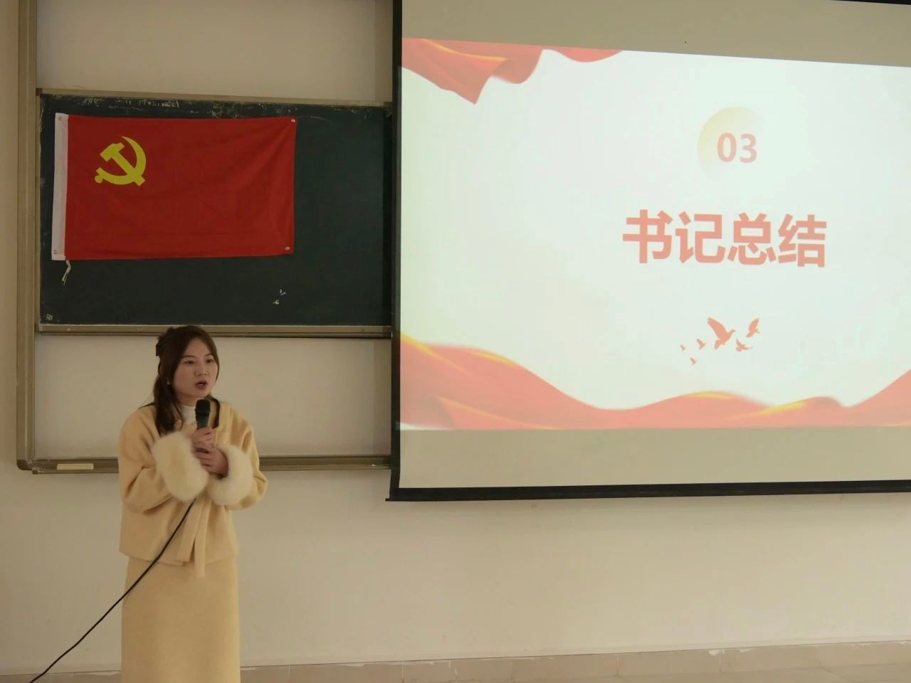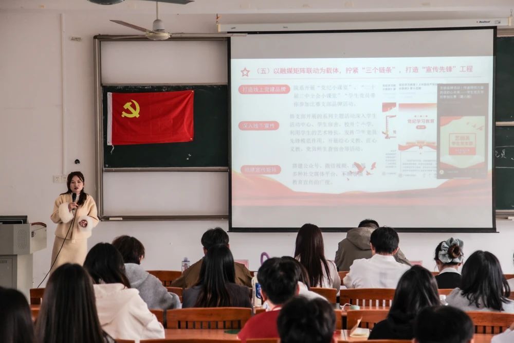 最后,支部书记陈娜对本次会议进行总结,她指出,作为学生党员,要不断提升思想自觉,强化责任意识,她期望学生党员们在今后能继续结合自己的思想认识和工作实际,秉承自我革命精神,充分发挥学生党支部在学校的战斗堡垒功能和先锋模范作用。