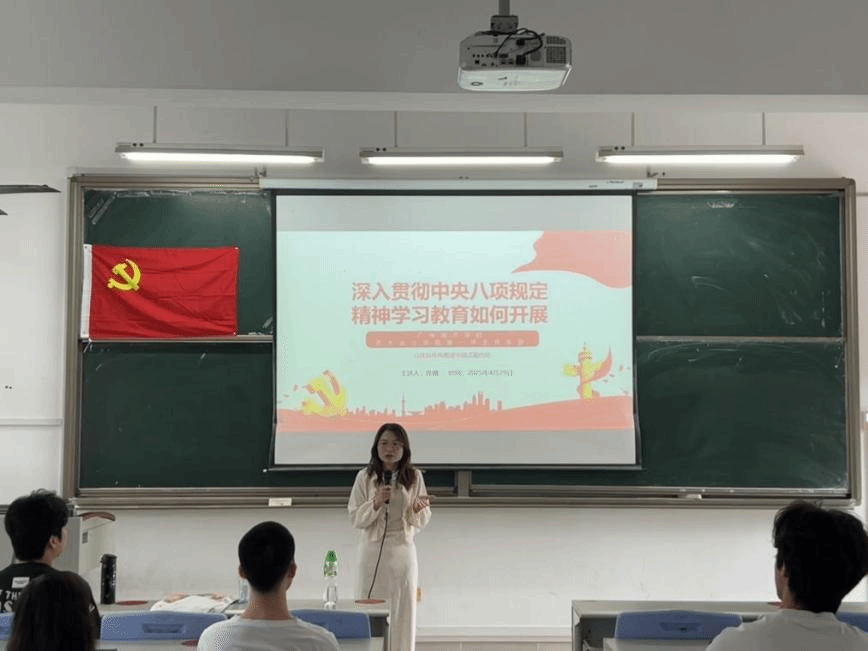 为深入贯彻中央八项规定精神,筑牢党员廉洁自律思想防线,4月29日中午,艺术太阳成集团tyc33455学生第一党支部在四教202室开展“严守八项规定,弘扬清风正气”主题党日活动。本次党日活动由艺术太阳成集团tyc33455学生第一党支部书记陈娜老师主持,学生第一党支部党员及积极分子参加。