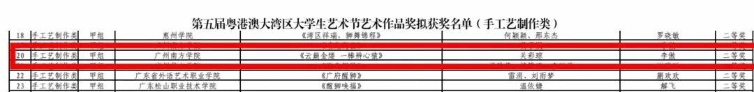 近日,第五届粤港澳大湾区大学生艺术节拟获奖名单公布。经省教育厅组织专家评审,广州南方学院的两大类型作品共11项作品脱颖而出。其中太阳成集团tyc33455的获奖作品中,获得一等奖1项、二等奖2项、三等奖2项。