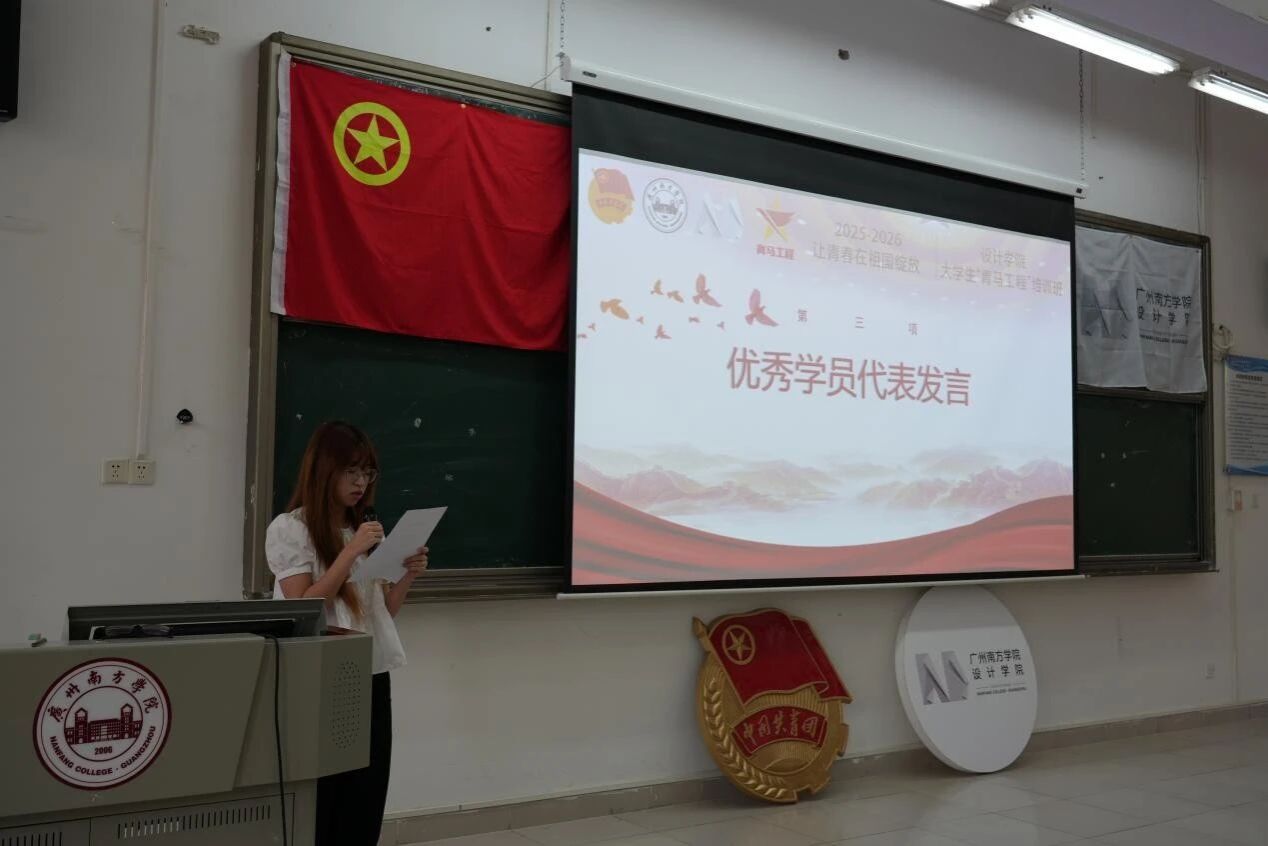 仪式期间,第四期青马班优秀学员代表莫炜婷同学围绕‘理论学习、实践锻炼、身份认同’三方面,分享了培训感悟。在理论学习方面,通过系统学习党团理论、参与读书与观影等活动,深化了对信仰与责任的理解,进一步明晰了“三个为什么”,补足了精神之钙,坚定了马克思主义信仰。在实践锻炼方面,在培训过程中,不仅提升了综合素质与工作能力,也在各类实践活动中增强了团队协作意识,为今后的学习与工作打下了坚实基础。在身份认同方面,结业不是结束,而是新的起点。作为青马班学员,这份身份既是荣誉,更是责任,未来将把所学所思转化为行动,积极投身学生工作,践行信仰。