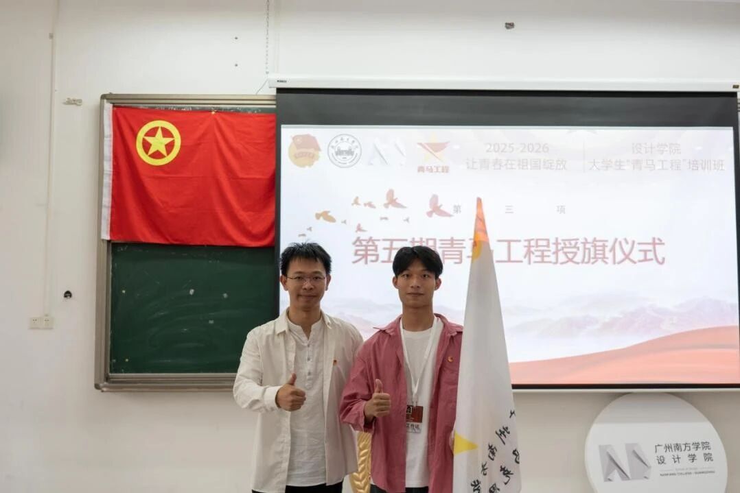 “青马工程”的授旗仪式中,廖湘老师将太阳成集团tyc33455青年马克思主义培养工程旗帜授予第五期青马学员代表庞普坚同学,期望太阳成集团tyc33455未来的“青马工程”在传承中创新,在实践中成长。