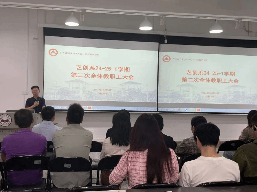为认真做好艺创系2025届毕业生就业工作,10月30日中午,艺创系召开2025届毕业生就业工作全体教师动员会。艺创系主任冯原,系党总支书记、副主任朱文山以及学系全体教师出席本次会议。会上,冯原主任结合2025届学系专业发展趋势、学校就业工作推进会议分析了当前艺创系学生的就业形势,表示当前学生就业形势严峻,希望艺创系全体教师肩负历史使命,积极投身于2025届毕业生就业工作中。