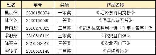 为积极响应“广东省大学生书法作品展”举办号召,弘扬中华优秀传统书法文化,达到“以文化人,以文育人”的育人成效,我院组织开展了广东省大学生书法作品展院内选拔赛。赛事围绕纪念抗战胜利80周年等主题,鼓励书法艺术创新,吸引了广州南方学院全体师生的积极参与。经学生报名提交、学院评审,现将获奖名单公示如下。