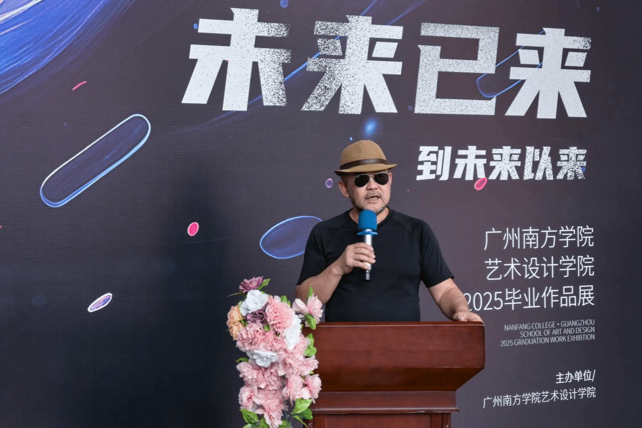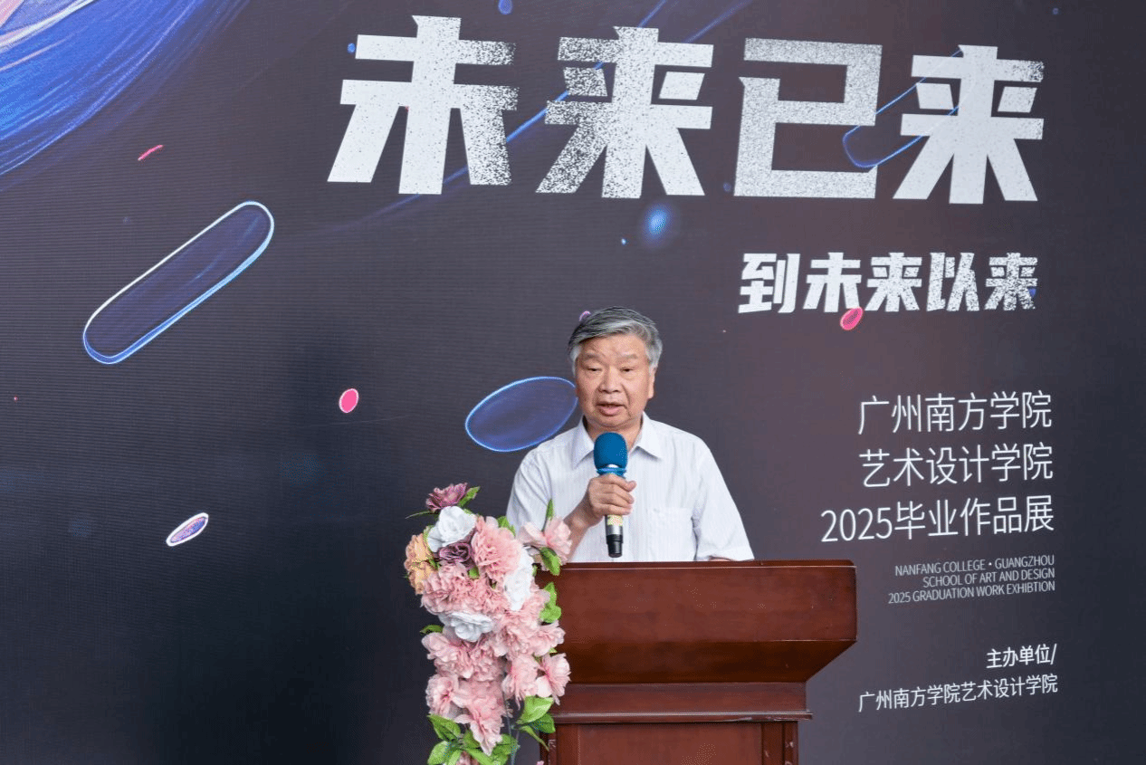 冯原院长在致辞中对各位领导嘉宾的到来表示衷心感谢。他表示,此次毕业展是学生们四年学习成果的集中展示,也是他们迈向未来的关键一步。展览主题紧密围绕技术革命和人工智能的发展,彰显了毕业生们作为新时代设计师的责任与担当。冯院长介绍,“未来已来,到未来以来” 的策展主题寓意着学生们站在新时代的前沿,将凭借创意和技术引领未来发展。他强调,每件展品都凝聚着学生的心血与智慧,充分展示了他们在创新和技术应用方面的卓越能力。冯院长期望毕业生们在未来的职业生涯中勇攀高峰,成为行业的佼佼者。