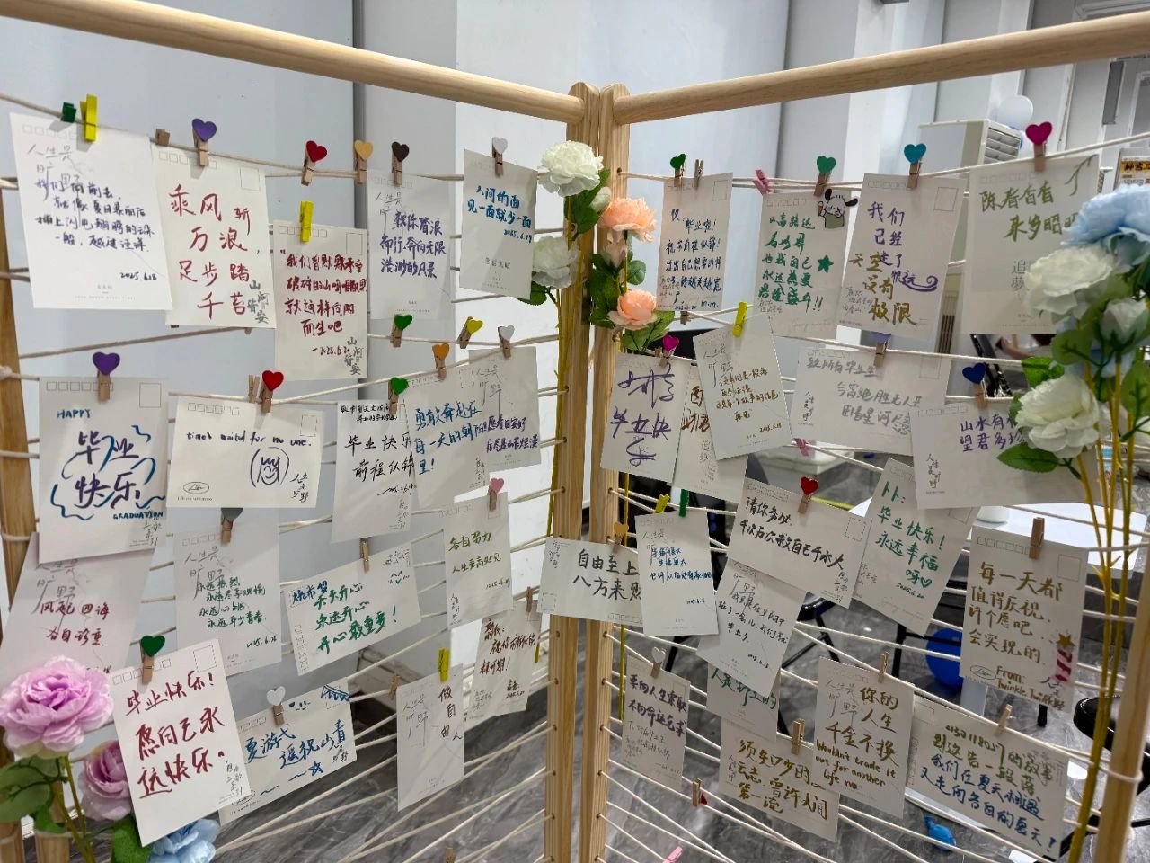 寄语时光区中,毕业生们在承载着美好寓意的明信片上,写下对未来的期许、对同窗的不舍、对老师的感恩。笔尖流淌出的真挚话语,是青春最动人的注脚,也是彼此间最温暖的告别。这些承载着回忆与祝福的文字,将随风远行,成为毕业生心中永不褪色的青春印记。