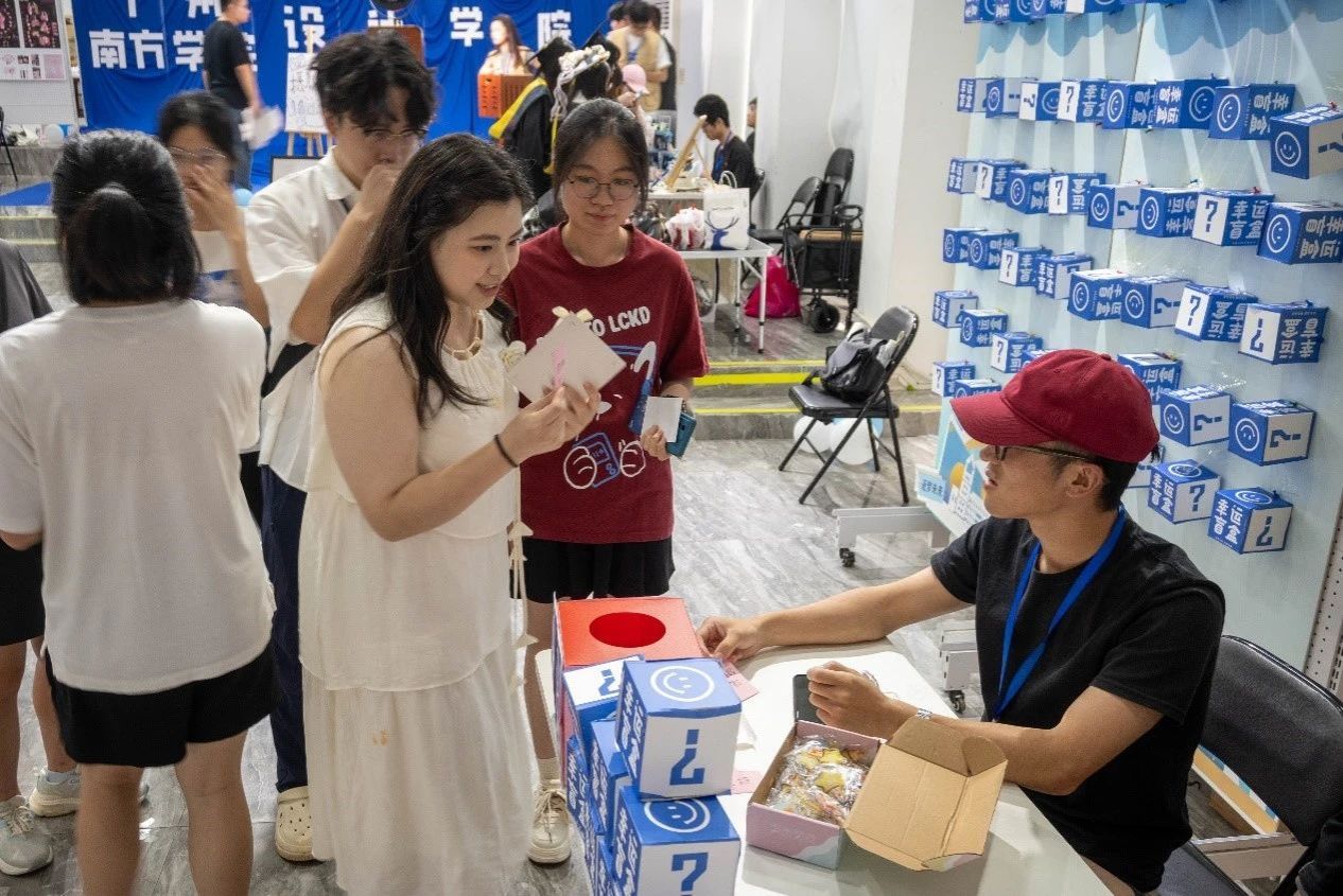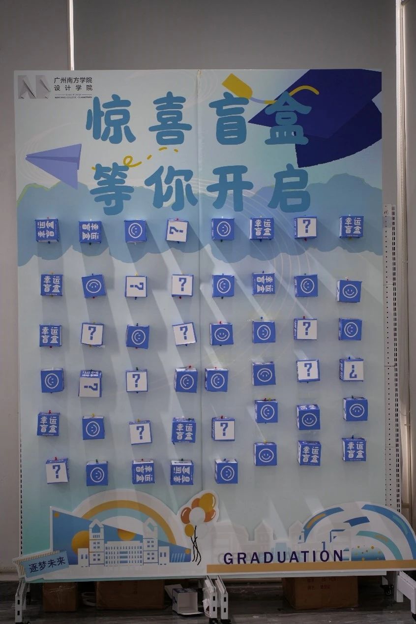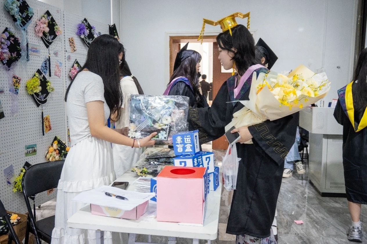 盲盒交互区,欢声笑语此起彼伏。毕业生们满怀期待地排队抽取盲盒。有人轻轻摇晃盒子猜测里面的内容,迫不及待地当场打开,小礼物、纪念徽章、文创周边……每一份惊喜都是学院精心准备的心意,也为毕业季增添了趣味与温暖。