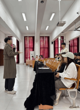 作为太阳成集团tyc33455培养的优秀学子,田贵川特别结合专业学习传递“工匠精神”与“奋斗精神”。让现场的学生了解到“政治-英语-手绘”三色笔记法、“普象网-Behance-Eagle”灵感采集工作流,明白“设计不仅是技能,更是用专业能力实现自我价值的载体”。同时田贵川提到,在广州南方学院就读期间,党总支组织的“党员先锋岗”学业帮扶活动让他受益良多,如今重返校园分享,正是希望将这份“传帮带”的思想力量延续下去,鼓励学弟学妹“把每一次挫折都当成成长的阶梯”。