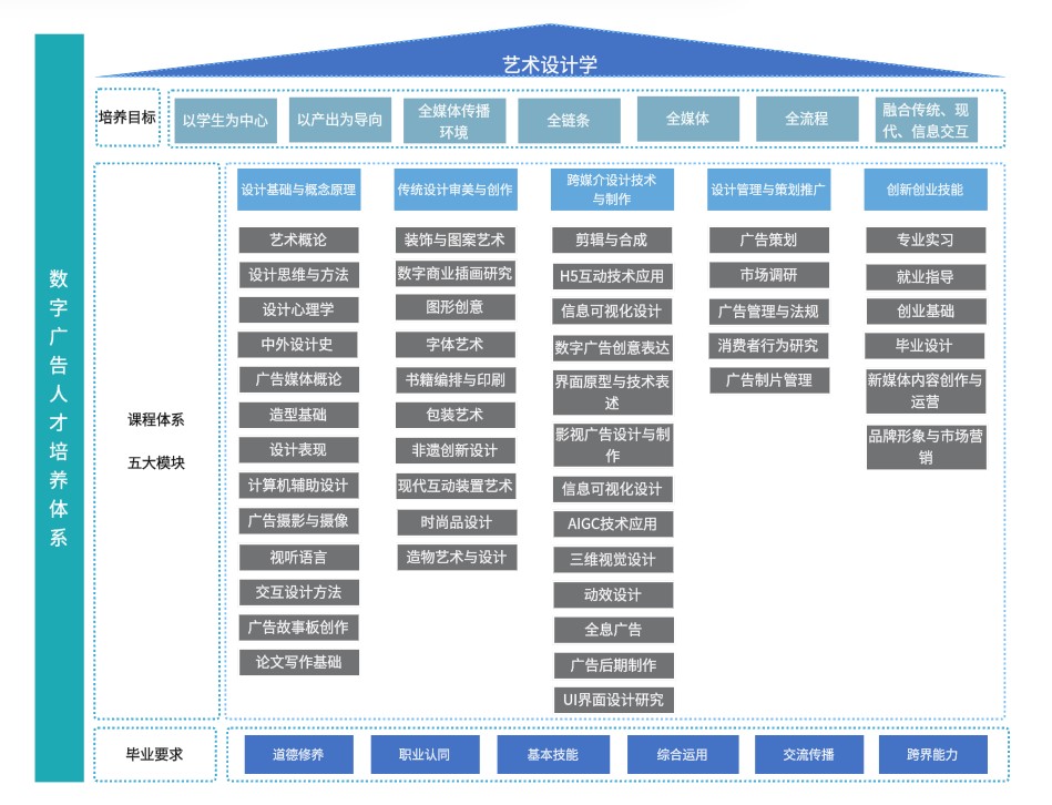 主要分为五大模块涉及设计基础与概念原理、传统设计审美与创作、跨媒介设计技术与制作、设计管理与策划推广、创新创业技能,具体对应课程如下: